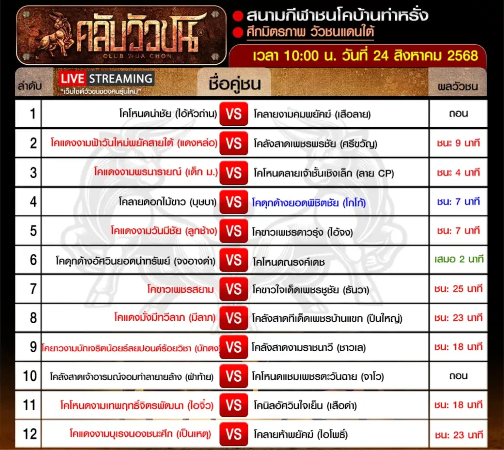 สรุปผลวัวชน สนามกีฬาชนโคบ้านท่าหรั่ง วันอาทิตย์ ที่ 24 สิงหาคม 2568 เริ่มชนเวลา 10:00 น