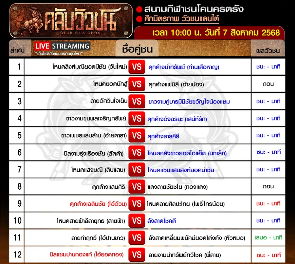 สรุปผลวัวชน สนามกีฬาชนโคนครตรัง วันพฤหัสบดี ที่ 7 สิงหาคม 2568