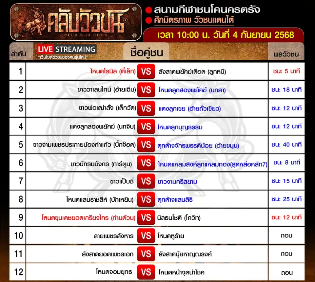สรุปผลวัวชน สนามกีฬาชนโคนครตรัง วันพฤหัสบดี ที่ 4 กันยายน 2568 เริ่มชนเวลา 10:00 น