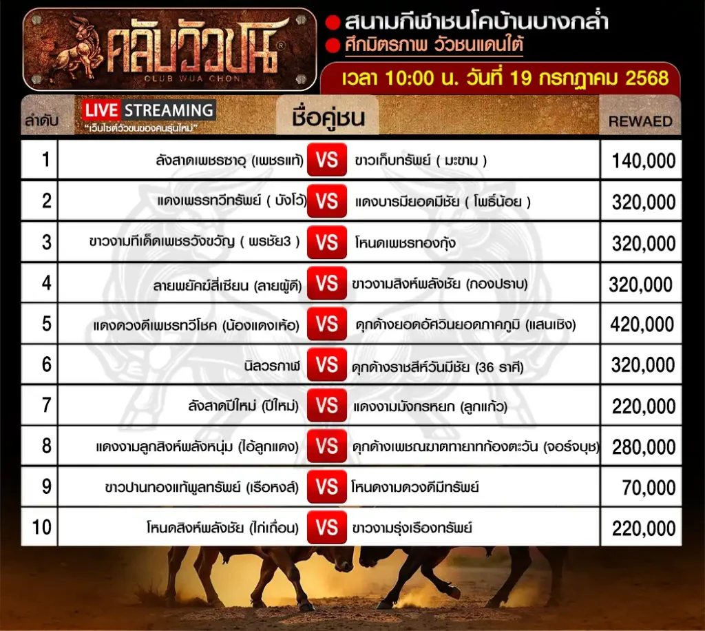 โปรแกรมวัวชน วันเสาร์ ที่ 19 กรกฏาคม 2568
