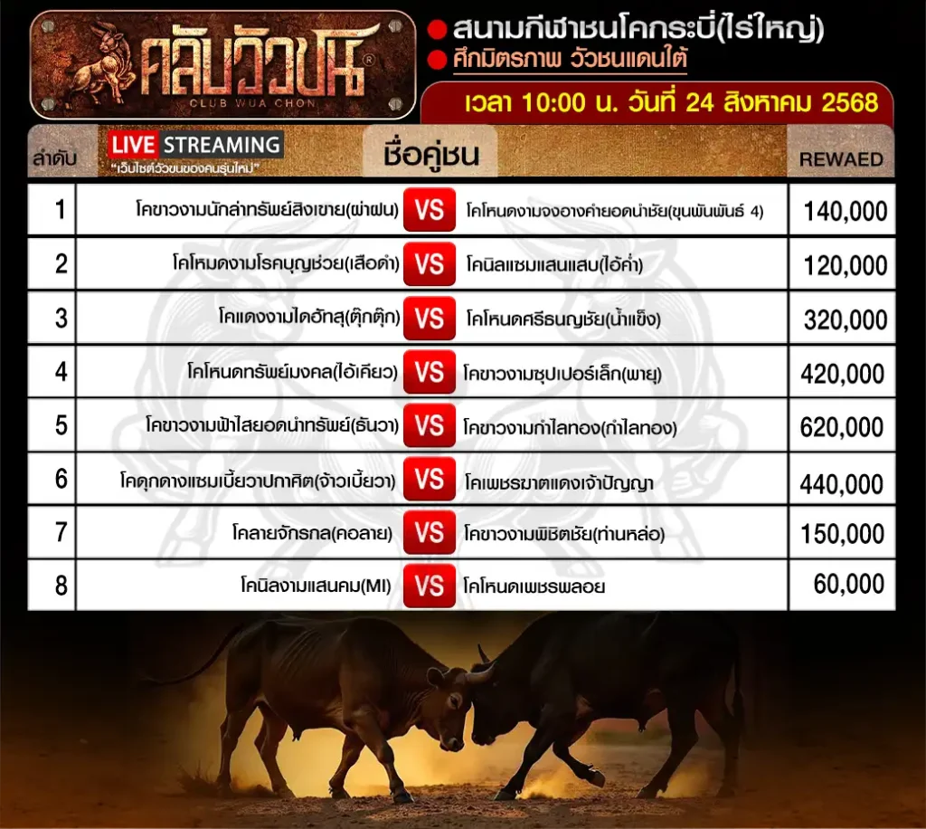 โปรแกรมวัวชน สนามกีฬาชนโคกระบี่(ไร่ใหญ่) วันอาทิตย์ ที่ 24 สิงหาคม 2568 เริ่มเวลา 10:00