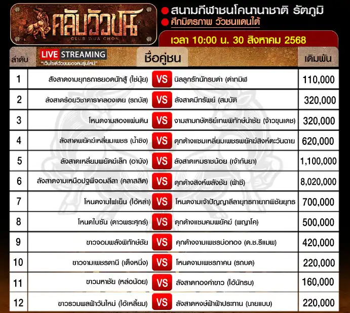 โปรแกรมวัวชน สนามกีฬาชนโคนานาชาติ วันเสาร์ ที่ 30 สิงหาคม 2568 เริ่มเวลา 10:00