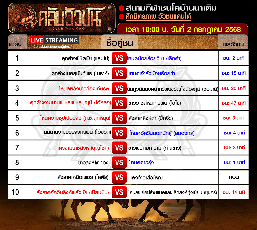 สรุปผลวัวชน สนามกีฬาชนโคบ้านนาเดิม วันที่ 2 กรกฏาคม 2568 เริ่มเวลา 10:00 น.