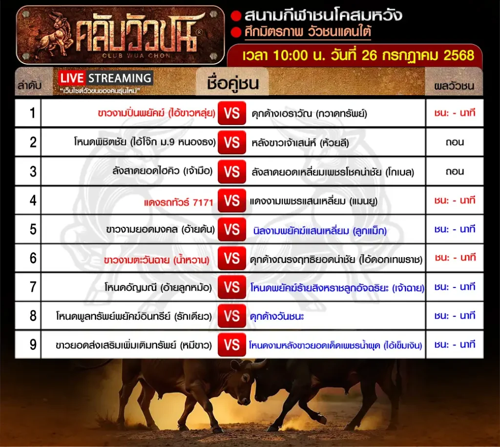 สรุปผลวัวชน สนามกีฬาชนโคกระบี่(ไร่ใหญ่) วันที่ 26 กรกฏาคม 2568 เริ่มเวลา 10:00 น.