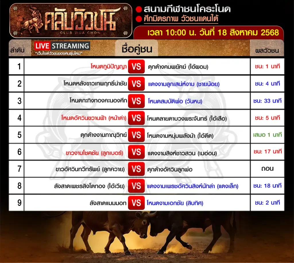 สรุปผลวัวชน สนามกีฬาชนโคระโนด วันจันทร์ ที่ 18 สิงหาคม 2568 เริ่มชนเวลา 10:00 น