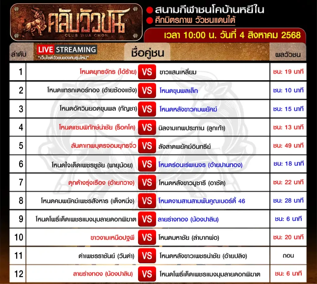สรุปผลวัวชน สนามกีฬาชนโคบ้านหยีใน วันจันทร์ ที่ 4 สิงหาคม 2568 เริ่มชนเวลา 10:00 น
