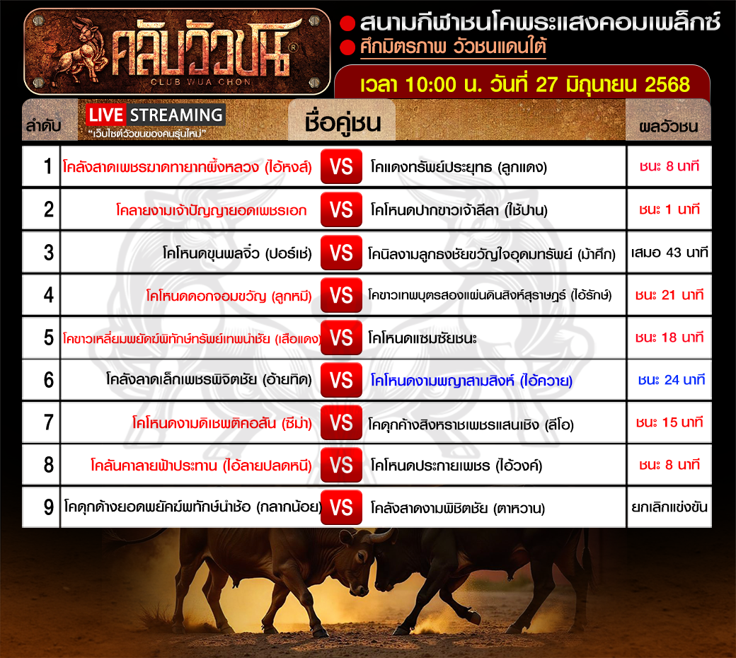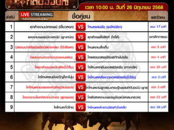 สรุปผลวัวชน วันพฤหัสบดี ที่ 27 มิถุนายน 2568 27 มิ.ย. 2568adminbemผลวัวชน สรุปผลวัวชน สนามกีฬาชนโคพระแสงคอมเพล็กซ์ […]